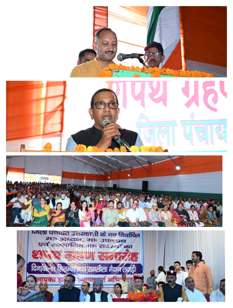 सोमवार को जिलाधिकारी/जिला निर्वाचन अधिकारी(पं.) प्रशांत आर्य ने जिला पंचायत के नव निर्वाचित अध्यक्ष को पद एवं गोपनीयता की शपथ दिलायी। विकास भवन के रामलीला मैदान में आयोजित शपथ ग्रहण समारोह में नव निर्वाचित जिला पंचायत अध्यक्ष रमेश चौहान ने पद एवं गोपनीयता की शपथ ली। उसके उपरांत अध्यक्ष जिला पंचायत रमेश चौहान ने उपाध्यक्ष एवं नवनिर्वाचित सदस्यों को पद एवं गोपनीयता की शपथ दिलायी। इस अवसर पर कैबिनेट मंत्री गणेश जोशी ने वर्चुअल माध्यम से नव निर्वाचित अध्यक्ष, उपाध्यक्ष एवं सदस्यगणों को बधाई एवं शुभकामनाएं दी।