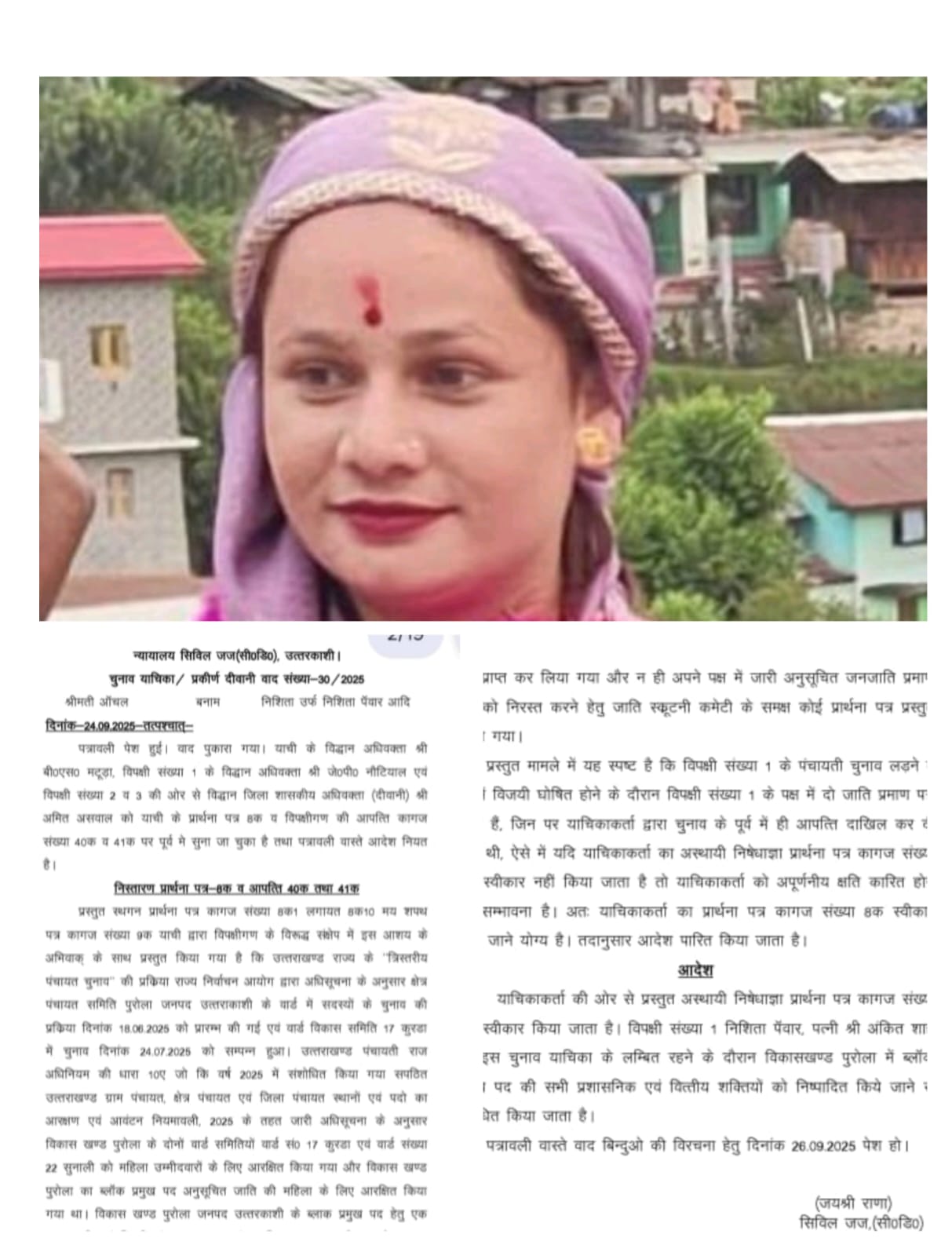 बता दें चुनाव याचिका संख्या 30/2025 में न्यायालय ने याचिकाकर्ता को बड़ी राहत देते हुए पुरोला क्षेत्र पंचायत प्रमुख नितिशा पंवार को बड़ा झटका देते हुए वित्तीय अधिकार सीज कर दिए हैं।
