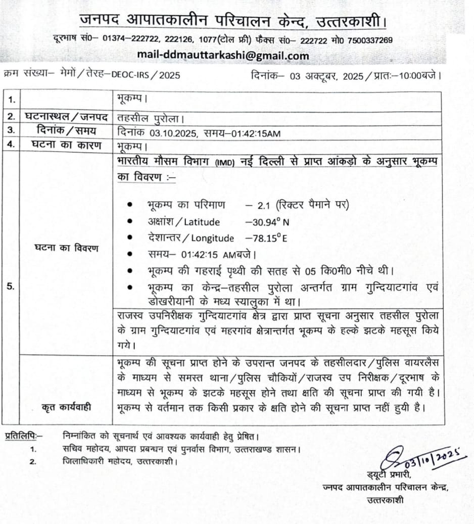 इधर राजस्व उपनिरीक्षक गुन्दियाटगांव क्षेत्र द्वारा प्राप्त सूचना अनुसार तहसील पुरोला के ग्राम गुन्दियाटगांव एवं महरगांव क्षेत्रान्तर्गत भूकम्प के हल्के झटके महसूस किये गये। भूकम्प की सूचना प्राप्त होने के उपरान्त जनपद के तहसीलदार/पुलिस वायरलैस के माध्यम से समस्त थाना/पुलिस चौकियों / राजस्व उप निरीक्षक / दूरभाष से सम
