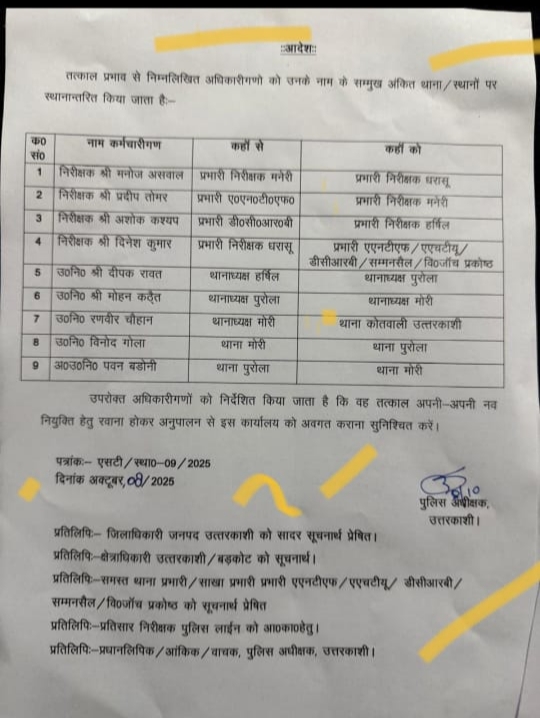 उत्तरकाशी : दीपावली से पहले उत्तरकशी जिले में बड़े स्तर पर थाना और चौकी प्रभारियों के बंपर तबादले किए गए हैं। बुधवार देर रात को ही एसएसपी उत्तरकाशी श्रीमती सरिता डोबाल ने थाना और चौकी प्रभारियों का बड़े स्तर पर ट्रांसफर किया है।