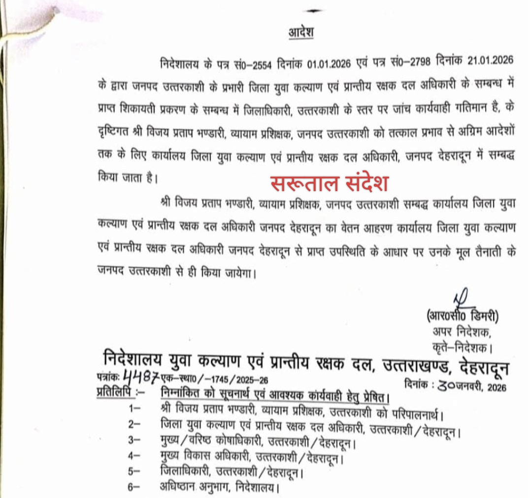 के पत्र सं0-2554 दिनांक 01.01.2026 एवं पत्र सं0-2798 दिनांक 21.01.2026 के द्वारा जनपद उत्तरकाशी के प्रभारी जिला युवा कल्याण एवं प्रान्तीय रक्षक दल अधिकारी के सम्बन्ध में प्राप्त शिकायती प्रकरण के सम्बन्ध में जिलाधिकारी, उत्तरकाशी के स्तर पर जांच कार्यवाही गतिमान है, के दृष्टिगत विजय प्रताप भण्डारी, व्यायाम प्रशिक्षक, जनपद उत्तरकाशी को तत्काल प्रभाव से अग्रिम आदेशों तक के लिए कार्यालय जिला युवा कल्याण एवं प्रान्तीय रक्षक दल अधिकारी, जनपद देहरादून में सम्बद्ध करने का आदेश जारी किया है।